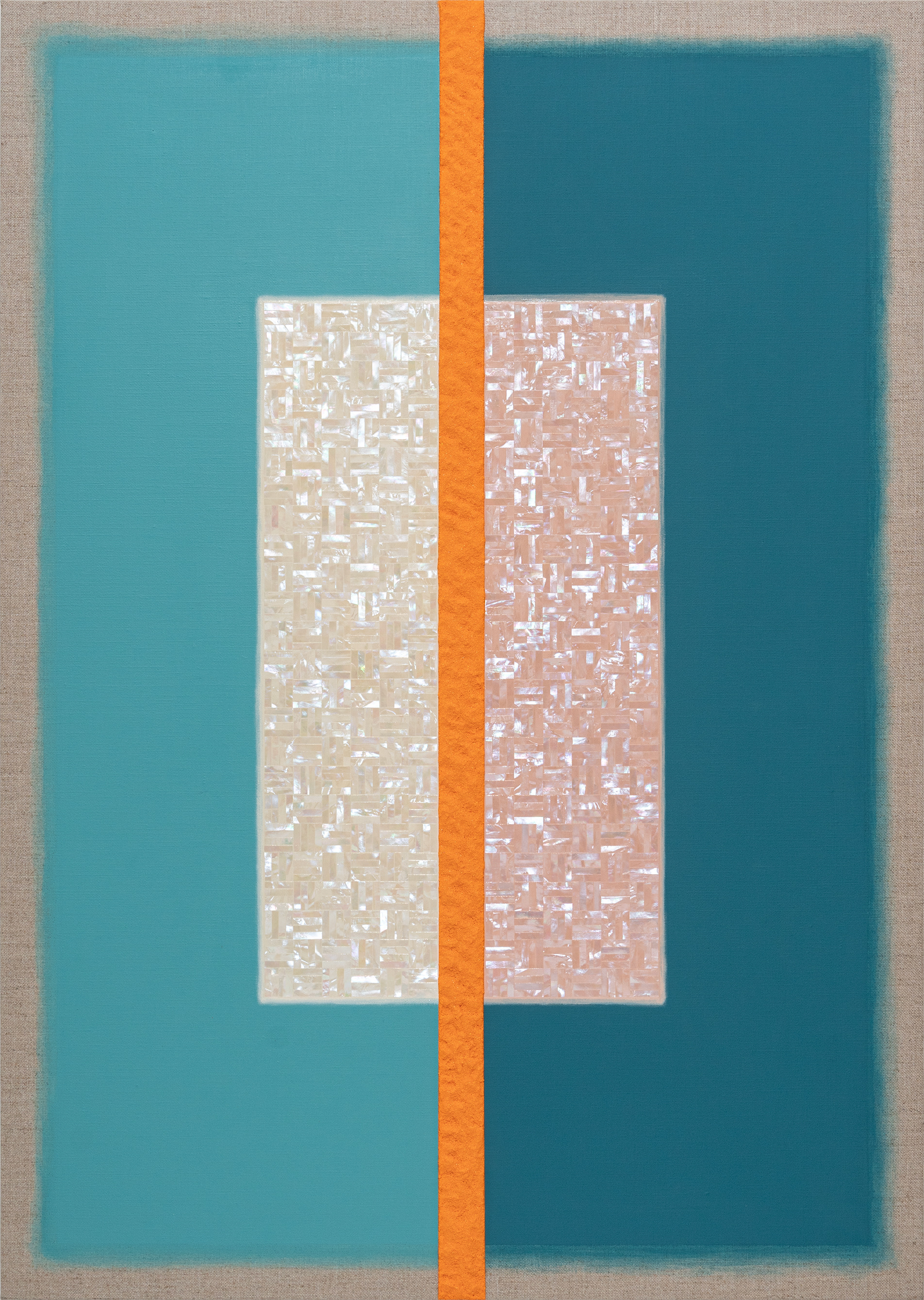 Mother-of-Pearl, Sand, and Acrylic Paint on Linen